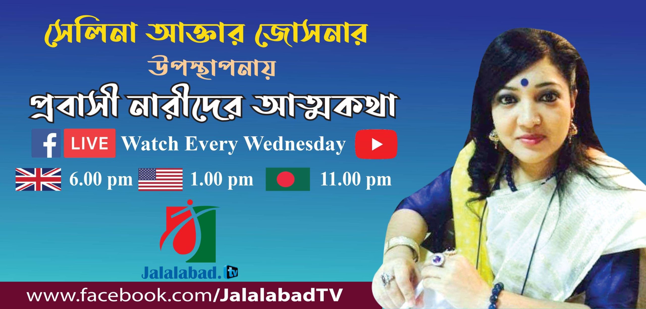 আগামী ১০ জুন বুধবার হতে জালালাবাদ টিভিতে প্রবাসে দৈনন্দিন জীবনের সুখ-দুঃখের কথা নিয়ে সপ্তাহের প্রতি বুধবার সেলিনা আক্তার জোসনার উপস্থাপনায় অনুষ্ঠিত হবে ‘প্রবাসী নারীদের আত্মকথা’।