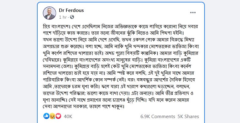 প্রিয় বাংলাদেশ। দেশে এসেছিলাম নিজের অভিজ্ঞতাকে কাজে লাগিয়ে করোনা নিয়ে সবার পাশে দাঁড়িয়ে কাজ করতে। তার জন্যে জীবনের ঝুঁকি নিতেও আমি পিছপা হইনি। যখন ভালো উদ্দেশ্য নিয়ে আমি দেশে এসেছি, তখন একদল লোক আমার বিরুদ্ধে মিথ্যা অপপ্রচার শুরু করেছে। বলা হচ্ছে, আমি নাকি খুনি খন্দকার মোশতাকের ভাতিজা কিংবা খুনি কর্নেল রশিদের খালাতো ভাই। অথচ পুরো বিষয়টি কাল্পনিক। আমার বাড়ি কুমিল্লার দেবিদ্বারে। কুমিল্লায় বাংলাদেশের অসংখ্য মানুষের বাড়ি। কুমিল্লা বাংলাদেশের একটি সনামধন্য জেলা। কুমিল্লায় বাড়ি হলেই কেউ খুনি মোশতাকের ভাতিজা কিংবা কর্নেল রশিদের খালাতো ভাই হয়ে যায় না। আমি স্পষ্ট করে বলছি, এই দুই খুনির সাথে আমার পারিবারিক কিংবা আদর্শিক কোনো সম্পর্ক নেই। বরং বঙ্গবন্ধুর আদর্শের সৈনিক হিসেবে আমি তাদেরকে চরম ঘৃণা করি। ফলে যারা এই খারাপ কথাগুলো ছড়াচ্ছেন, বলছেন, তাদের উদ্দেশ্য পরিস্কার; ভালো কাজে বাধা দেয়া। এটা অন্যায়। আমি তীব্র প্রতিবাদ ও ঘৃণা জানাচ্ছি। সেই সাথে প্রমাণের জন্যে চ্যালেঞ্জ ছুঁড়ে দিচ্ছি। যদি মনে করেন আমার সেবা আপনাদের দরকার, তাহলে পাশে থাকুন। (কালের কন্ঠ)