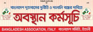 এসব দুর্নীতি এবং দালালি বন্ধ করে অবিলম্বে প্রবাসীদের স্বার্থ রক্ষায় ব্যবস্থা গ্রহণের দাবিতে সোমবার বাংলাদেশ সমিতি ইতালি দূতাবাসের সামনের সড়কে অবস্থান কর্মসূচি পালন করবে।