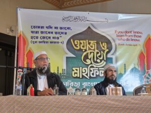 ওয়াজের প্রধান বক্তা, মুফতি শাযখ রুহুল আমিন বলেন, আপনার জীবনে ৩০/৪০ টি রমজান এসেছে, আপনি কি ৩০ টি গুনাহ ত্যাগ করেছেন। ইমান কে শক্ত করতে হবে। হালাল রোজি করতে হবে৷ আমরা নিজেদের কাল নয়, পরশু নয়, আজ থেকে বদলে ফেলব।
