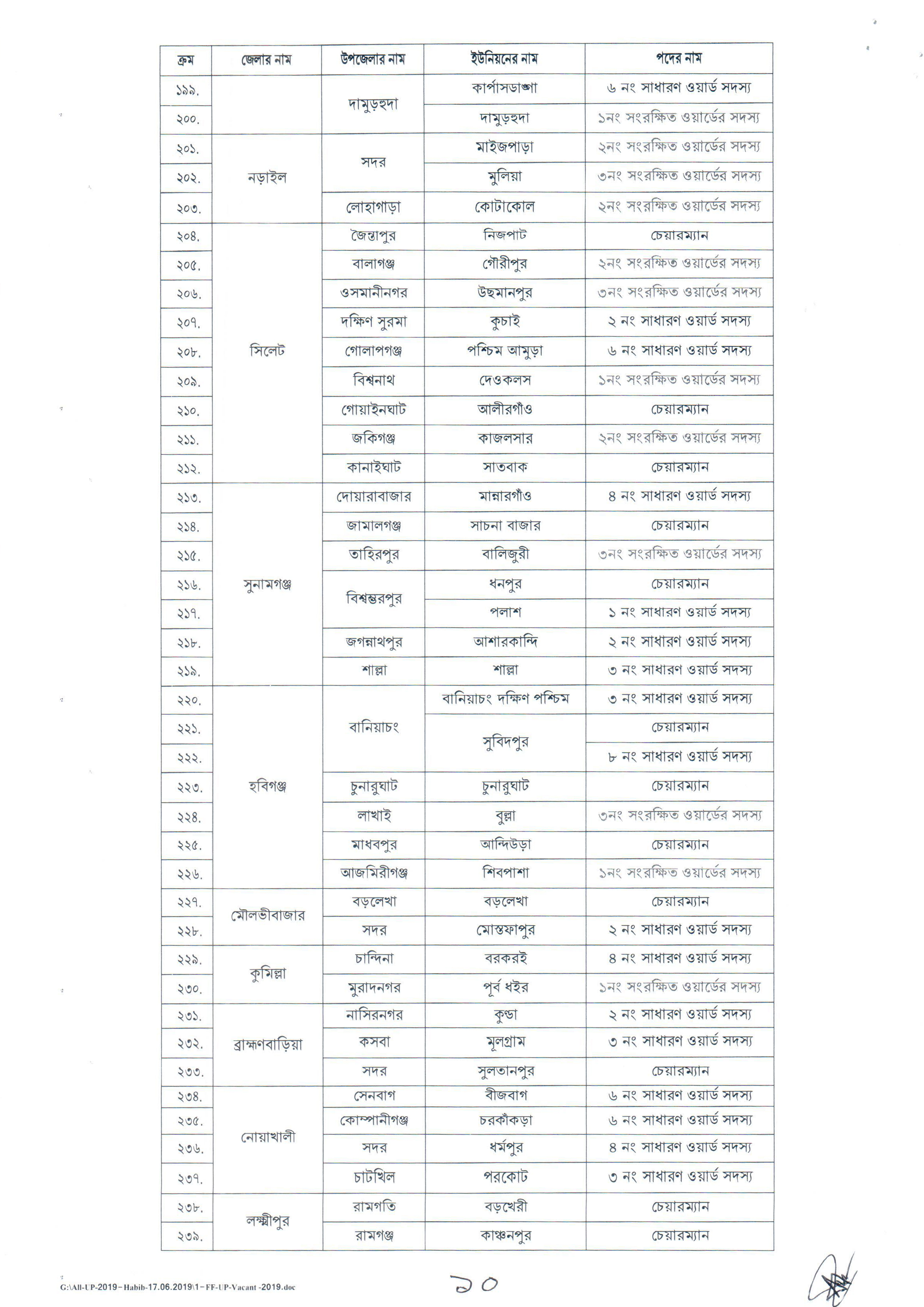 সদস্য: গোলাপগঞ্জ উপজেলার আমুড়া ইউপির ৬ নং ওয়ার্ডের সাধারণ সদস্য পদে, বালাগঞ্জ উপজেলার গৌরিপুর ইউনিয়নের ২নং সংরক্ষিত সদস্য পদে, ওসমানীনগর উপজেলার উছমানপুর ইউপির ৩নং সংরক্ষিত সদস্য পদে, কুচাই ইউপির ২নং সাধারণ সদস্য পদে, বিশ্বনাথ উপজেলার দেওকলস ইউপির ১নং সংরক্ষিত সদস্য পদে, জকিগঞ্জ উপজেলার কাজলসার ইউপির ২নং সংরক্ষিত সদস্য পদে।